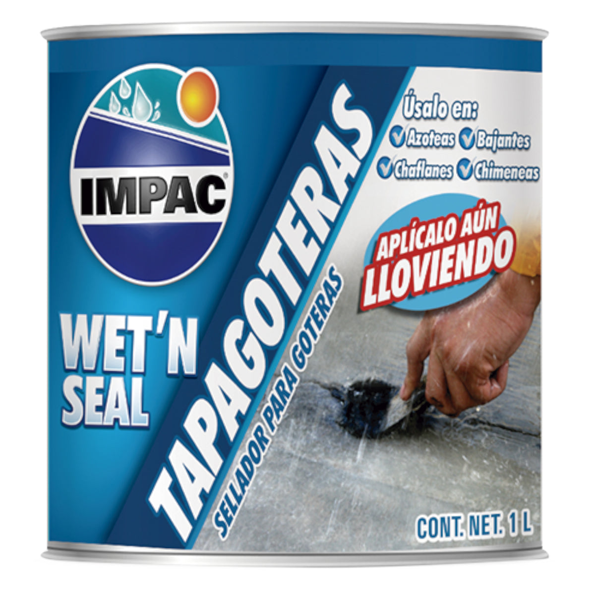 Impac wet n seal es un sellador asfaltico libre de asbesto, de apariencia fibrosa y de consistencia espesa, fabricado con asfalto, ACEite plastificante, fibras sinteticas, carga mineral y mezcla de aditivos que le permiten adherirse sobre superficies de concreto humedas para reparaciones urgentes.